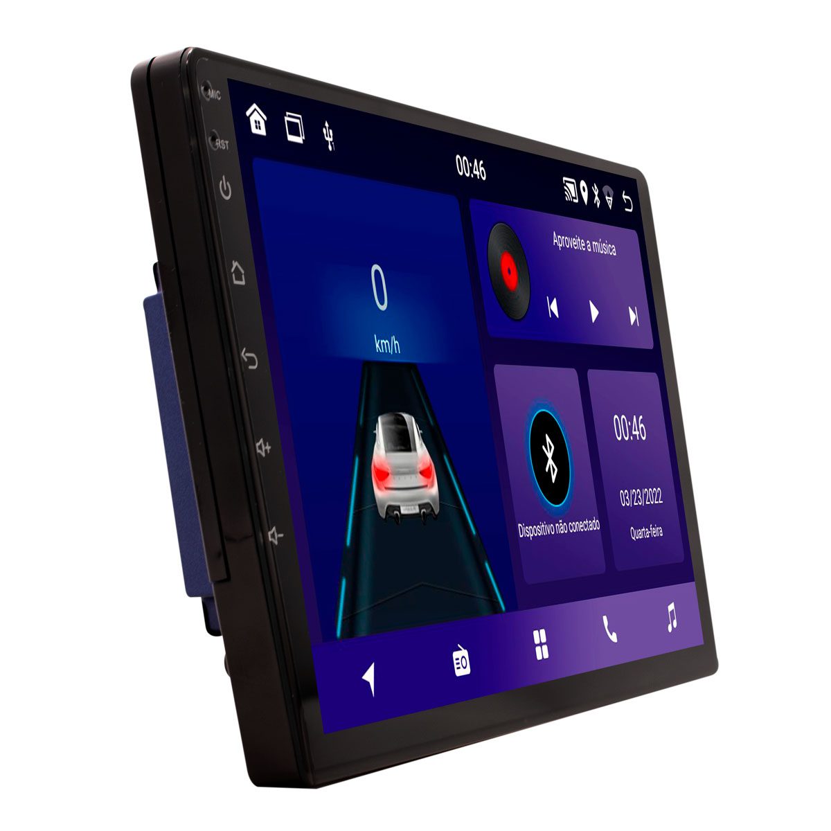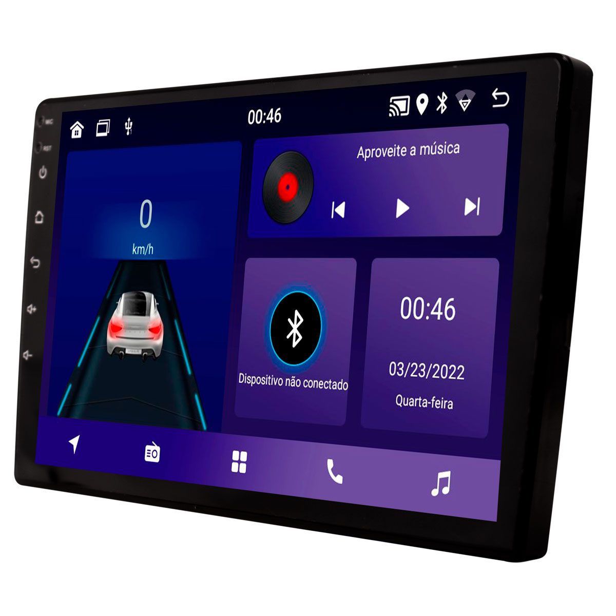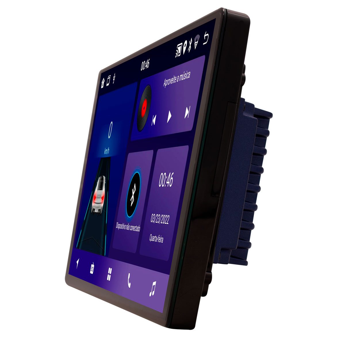 AUX/AV: 2 – Entradas de vídeo, 1 – Saída de vídeo, 2 – Saídas de áudio, 2 – Entradas de áudio, 1 – Entrada Mic BT, 1 – Saída 12 Volts.